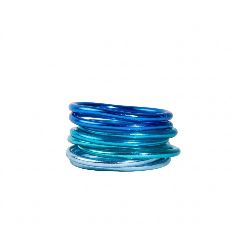 Includes 2 bangles in each color: Light Blue, Blue, Sky Blue and Turquoise.