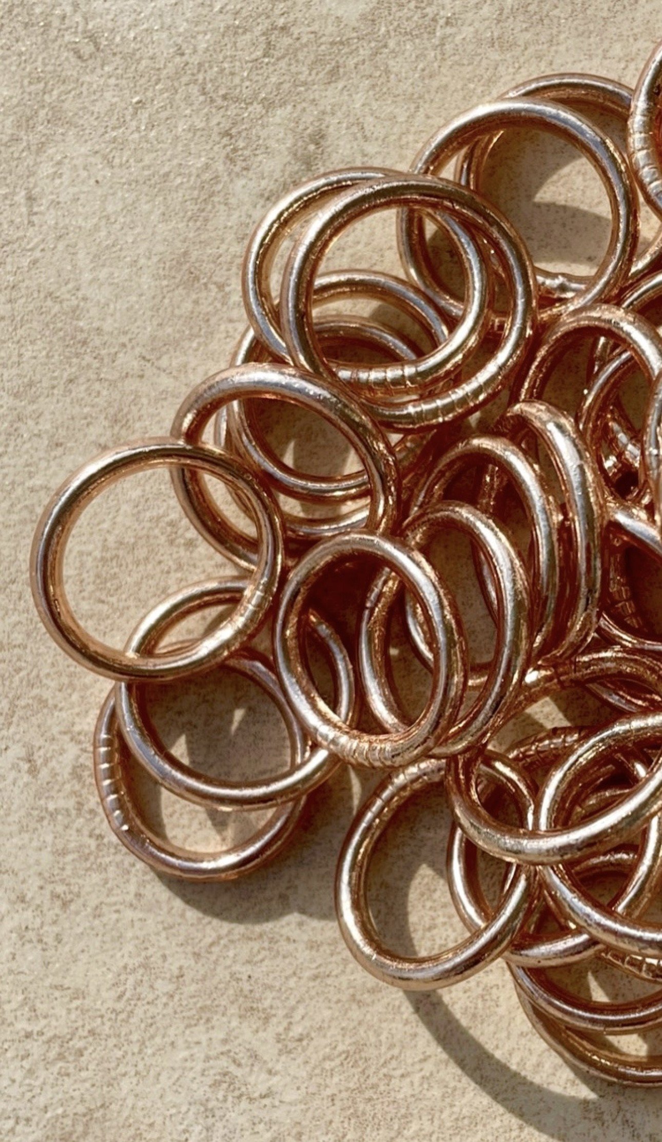 The ring is made of a flexible plastic tube filled with gold and silver leaf foil and seal with a connector.